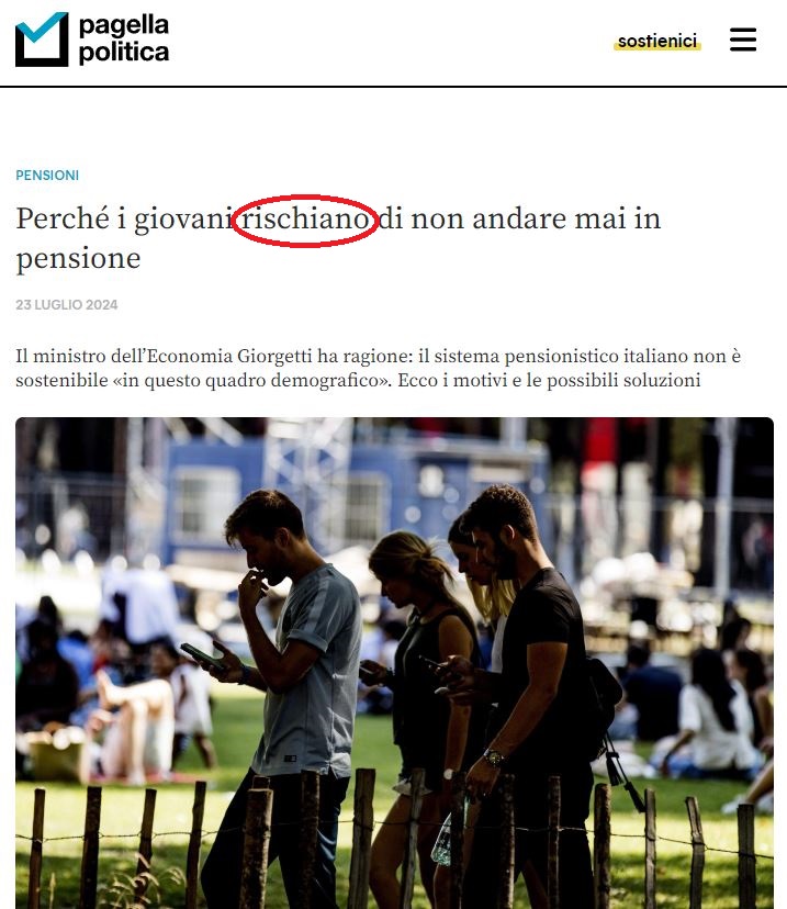 I giovani "rischiano" di non andare mai in pensione... Ciclicamente durante i mesi estivi, fra gossip e scemenze varie con cui la classe dirigente distrae anche se stessa, escono fuori queste notizie che suscitano appena qualche lamentio. Di nuovo la brutta notizia