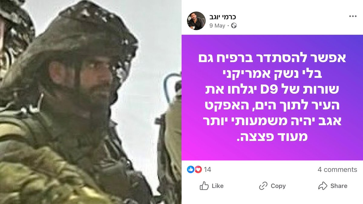 โRafah can be dealt with even without American weaponry. Rows of D9 bulldozers will clear the city into the sea. By the way, the effect will be more significant than another bomb.โ