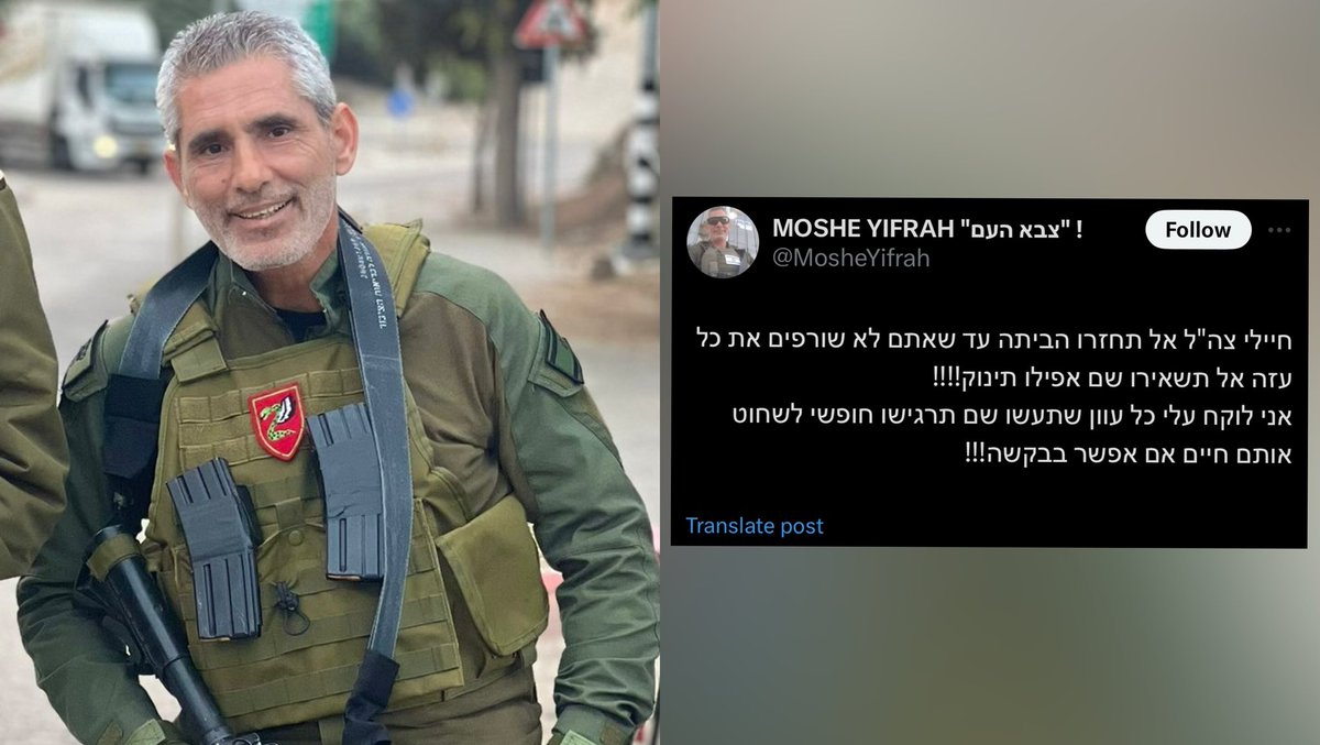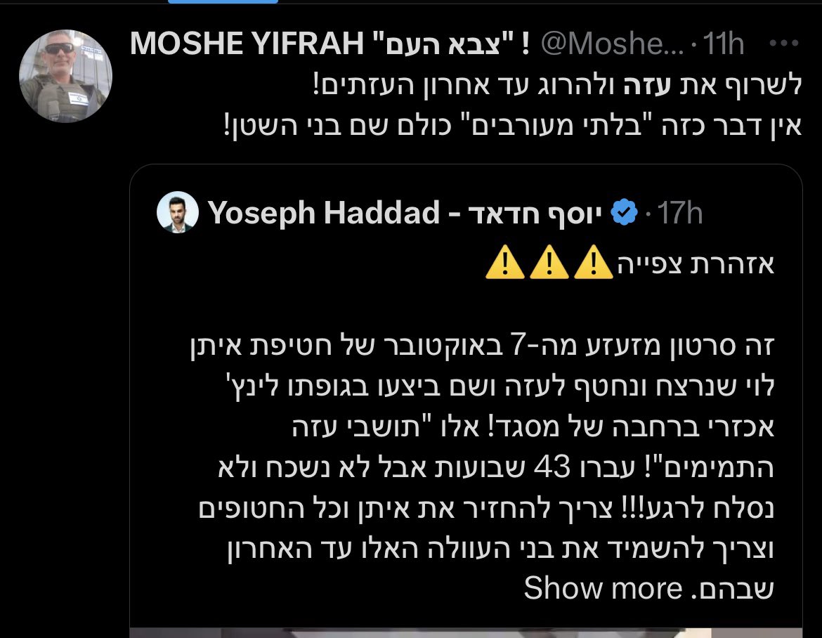 โDo not return home until you have b**ned all of Gaza. Leave not even a baby there!!!! I take upon myself any sin you commit there. Feel free to slau**r them alive if possible, please!!!"โ ->