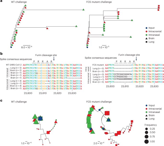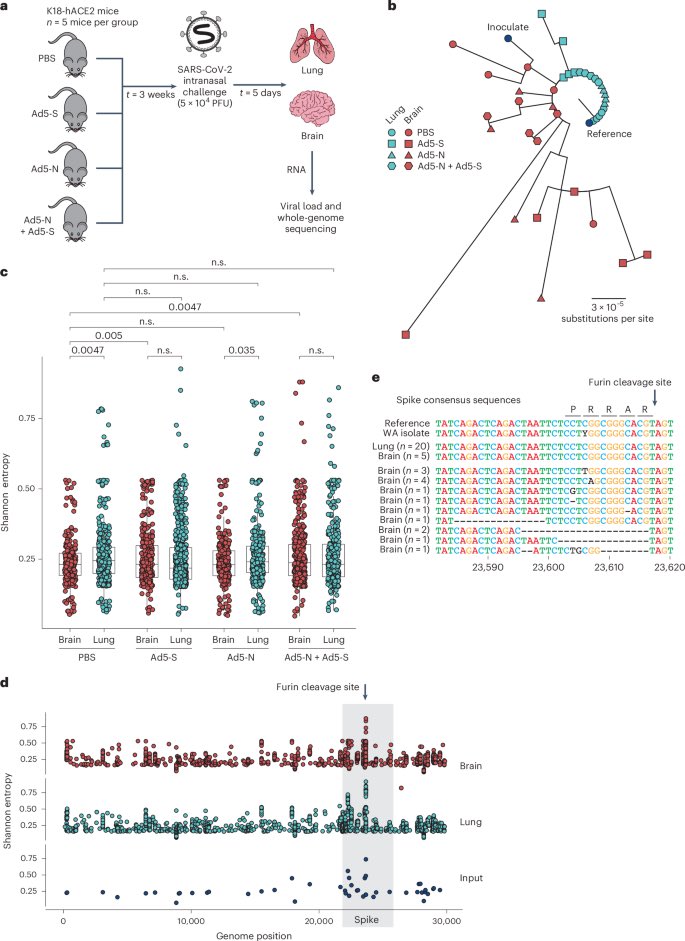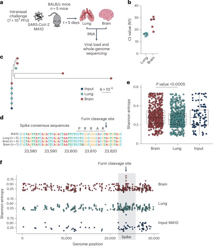 They assessed SARS-CoV-2 evolution in the lung versus CNS of infected mice. Higher levels of viral divergence were observed in the CNS than the lung after intranasal challenge with a high frequency of mutations in the spike furin cleavage site (FCS). 3/
