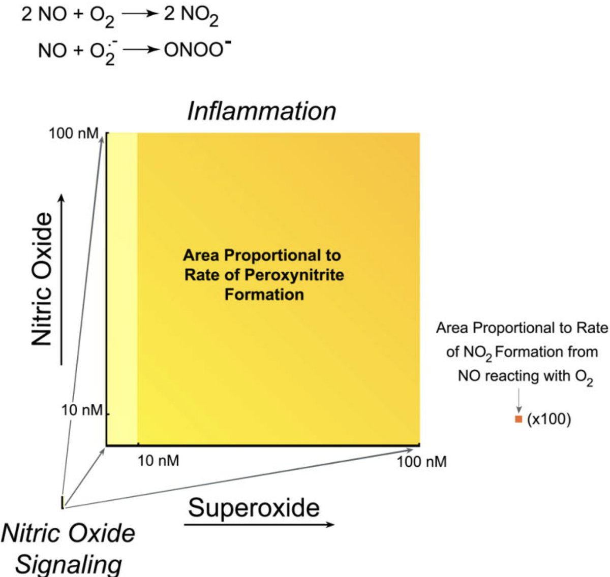 Right below: increase in peroxynitrite formation if the formation of superoxide production increased either 100-fold (yellow) or 1,000-fold (yellow-orange), increases that can reasonably occur with the activation of NADPH oxidase. Nitric oxide is shown to increase only 10-fold and could rise to ~1 μM in highly inflamed states.