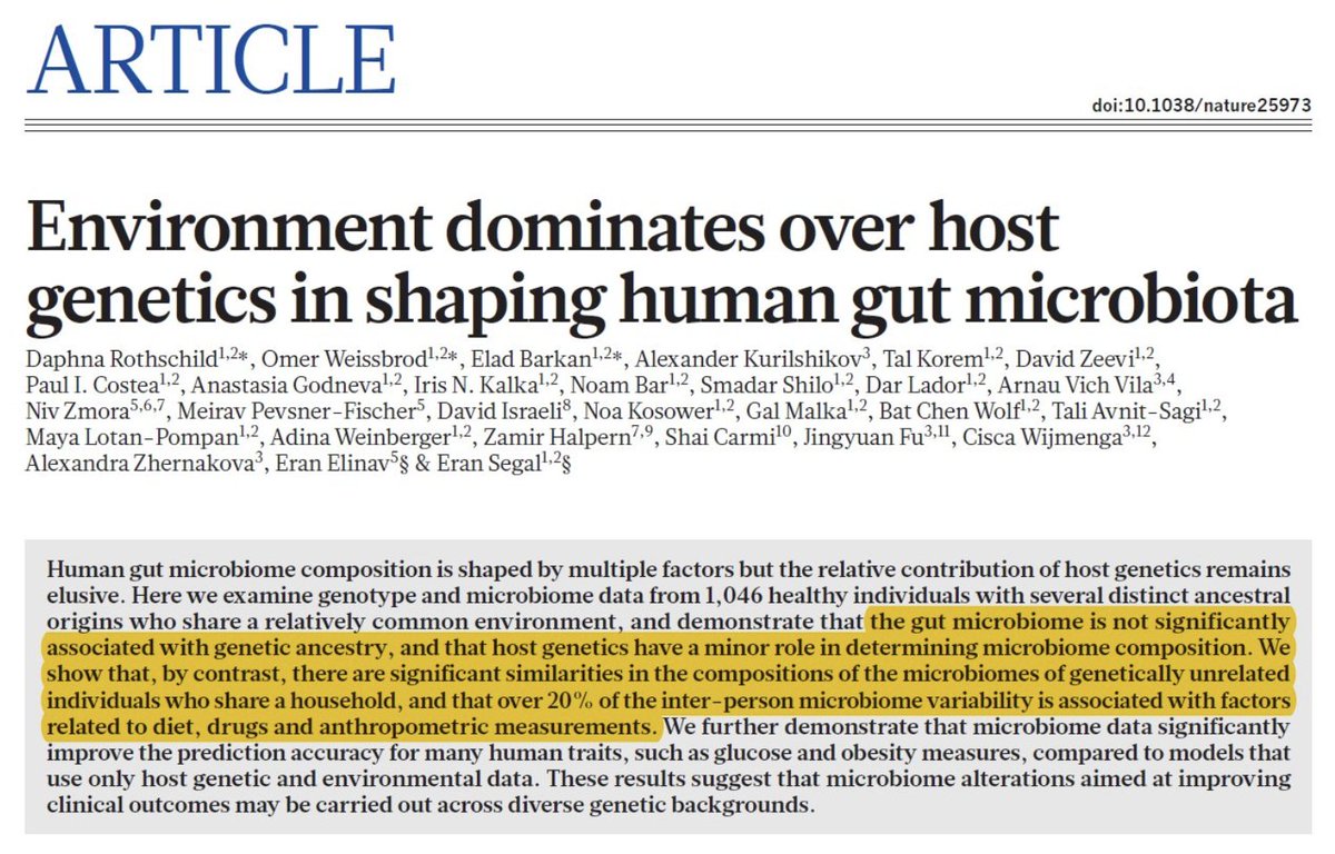 Today, we have proof this is true in the microbiome of man. Our nuclear genes are just not as important as our daily habits in determining our gut microbiome. Mitochondriac wisdom is getting more proof that environment controls our genes. I wonder when researchers will gain this insight? Environmental signals in waveforms affect our mt DNA and our mitochondrial matrix to modulate the function of the nuclear genes. nature.com/articles/natur…