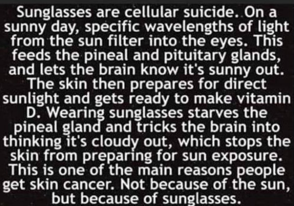 2. With time it will be shown the major cause of skin cancer is wearing sunglasses, contacts, or having intraocular lenses placed for cataracts. When you do this, it down regulates melanin production in the skin and brain.