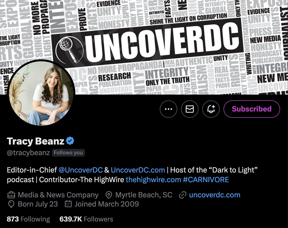 #4 Tracy Beanz (@tracybeanz) is one of the first people I connected with after getting banned from Twitter 1.0. Carnivore, based, and always supportive and incredibly passionate about her investigative journalism, which dives deep into American domestic politics.