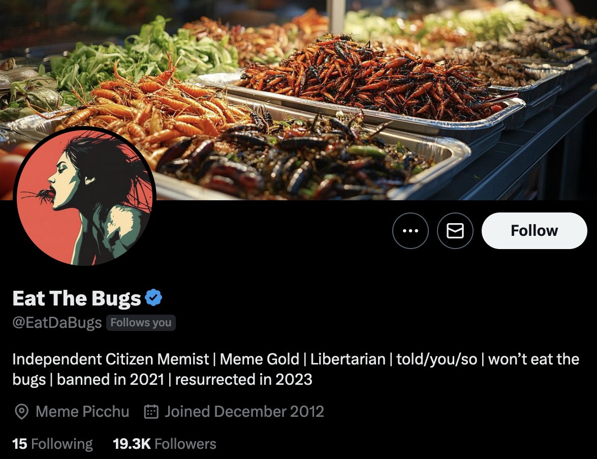#6 Eat The Bugs (@EatDaBugs) is, as the name suggests, a sharp critic of Agenda 2030 and the WEF. Recently reinstated by Elon, this account is a must-follow for its relentless takedowns of globalist narratives. Plus, the memes are top-tier!