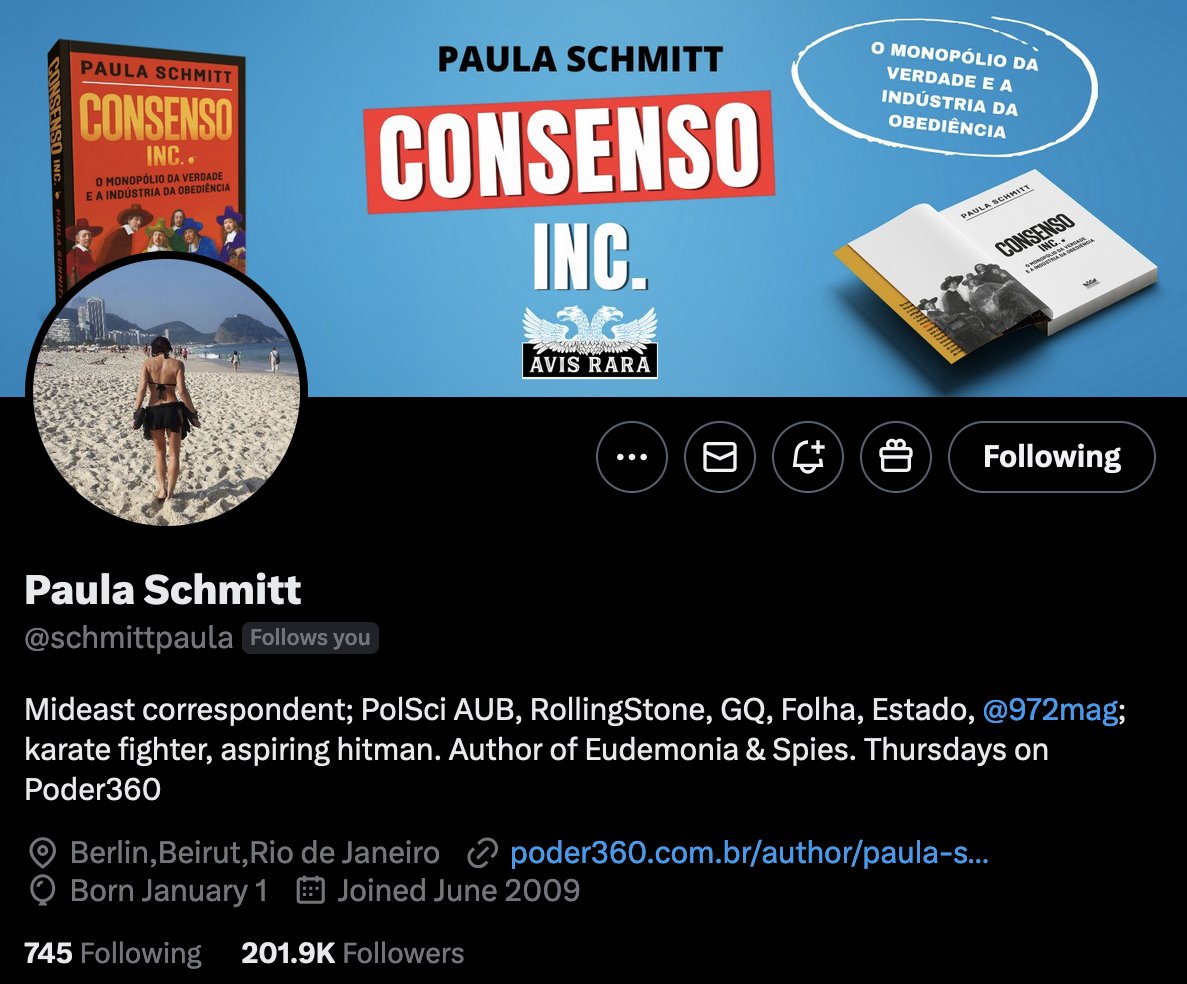 #9 Paula Schmitt (@schmittpaula) is a Brazilian journalist who always seems to land on the right side of history. If you’re interested in insightful views from Brazil and beyond, she’s a must-follow.