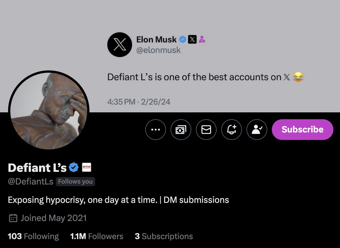 #10 Defiant L’s (@DefiantLs) excels like no other at exposing the hypocrisy of people on this platform. By juxtaposing old tweets with new ones, they highlight the double standards and contradictions that often go unnoticed.