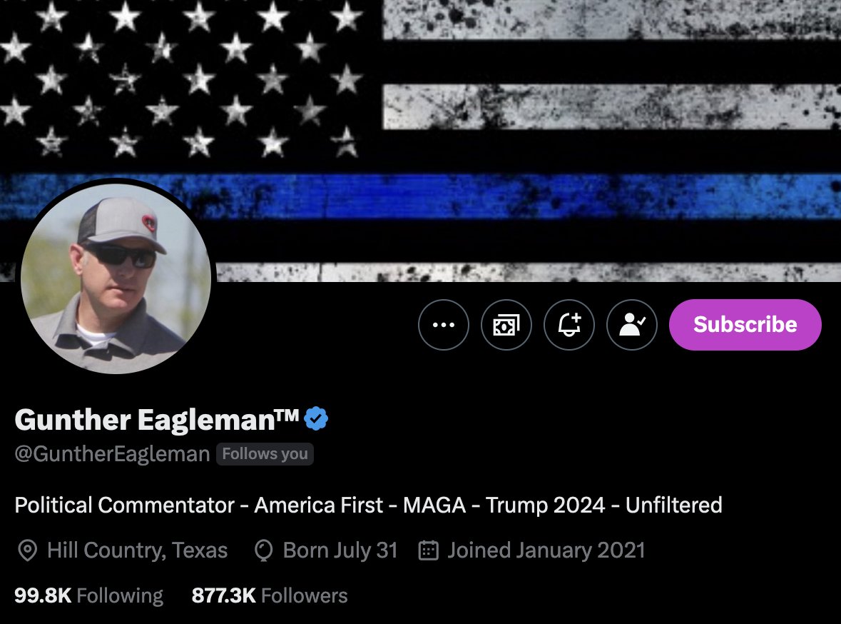 #17 Gunther Eagleman (@GuntherEagleman) is probably the most visible commentator on this platform, consistently ratioing liberal posts. Love him or hate him—I love that dude!
