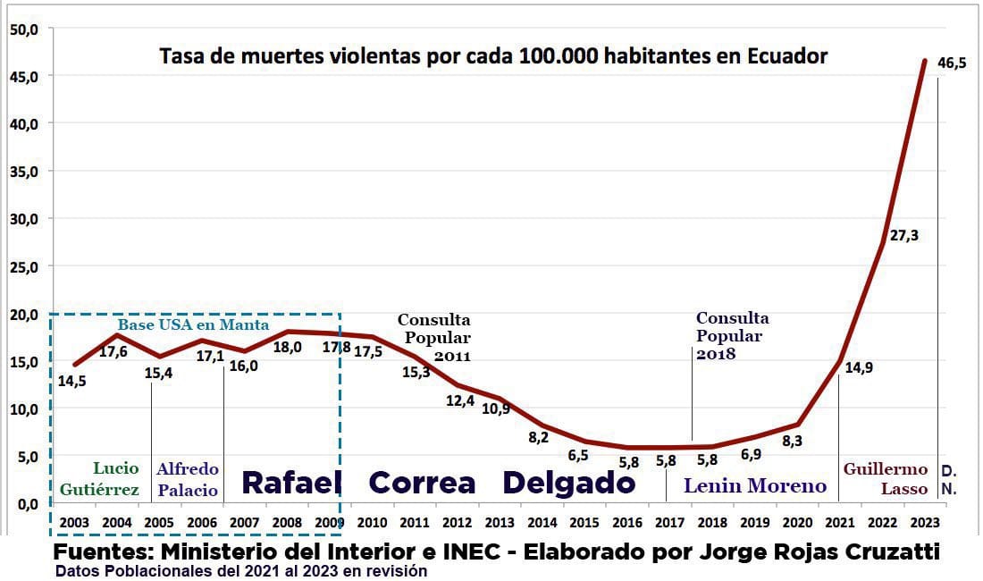 A su vez, la reducción del Estado de las políticas neoliberales ha reproducido las leyes de la selva en el país y su efecto inmediato ha sido que Ecuador pase de ser el segundo país más seguro de la región a tener un serio problema con el narcotráfico en el país.+