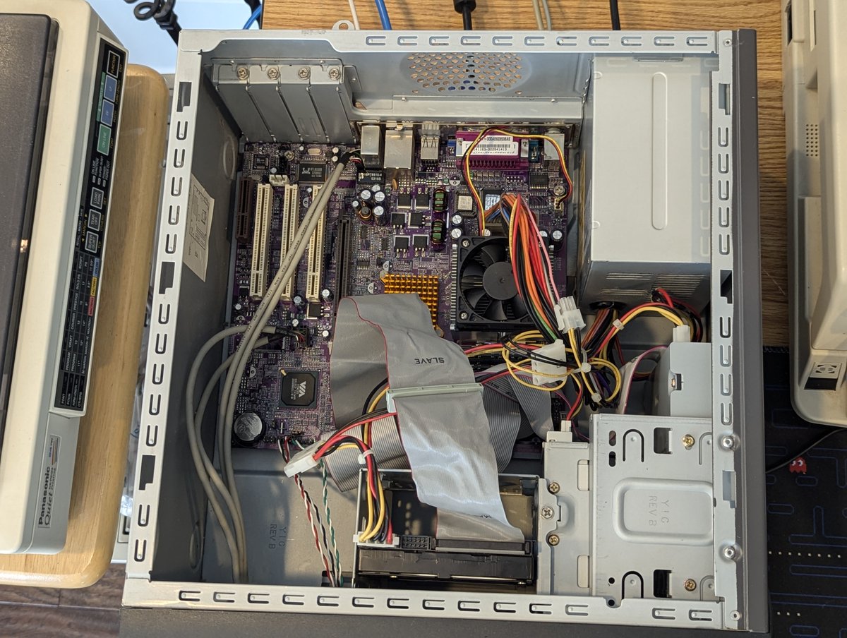 On reassembly, I fought the CD-ROM a bit. At first, I thought it might have been a cable issue since that cable is pretty pinched! I did forget that the CD-ROM needs to be plugged into the "ISA IDE" connector on the Promise card which is the bottom connector here.