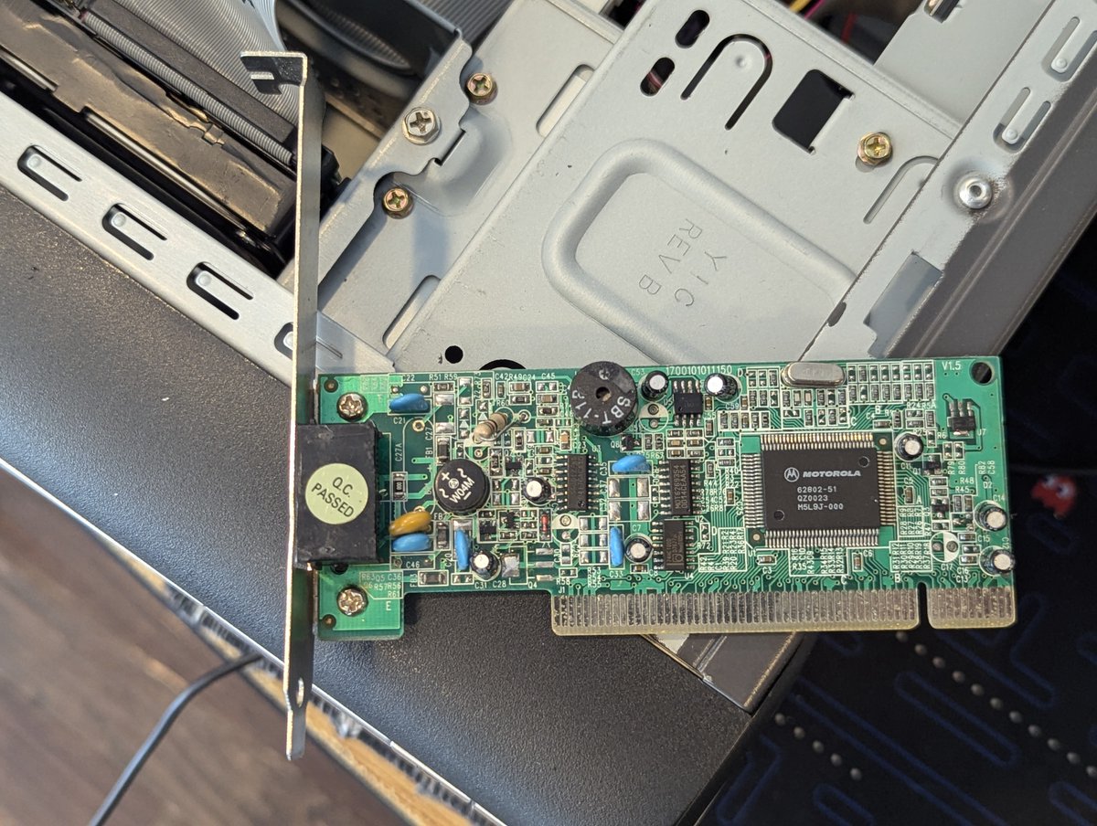 So, that's the nickel tour! When I put things back together, I did put the cards in a slightly different order. You do have to juggle a bit given how small this case is: no big ISA cards in the first couple of slots, and putting the NIC in the bottom slot makes the clip tight.