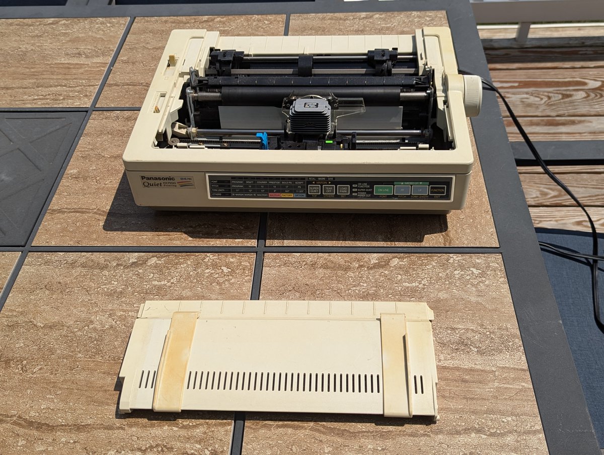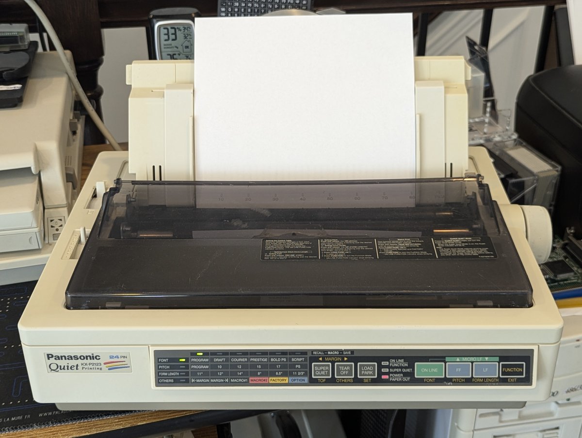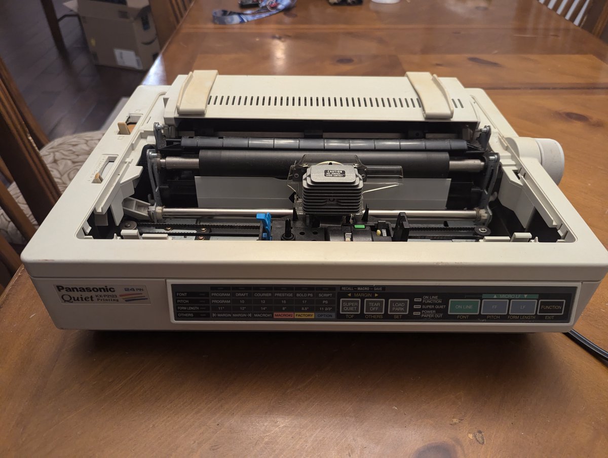 It's time to finally give my new Panasonic KX-P2123 a true test. I bought it about a week ago, and just finished retrobrighting a few parts and got it reassembled. Let's take a look (and a listen!) in a 🧵 here!
