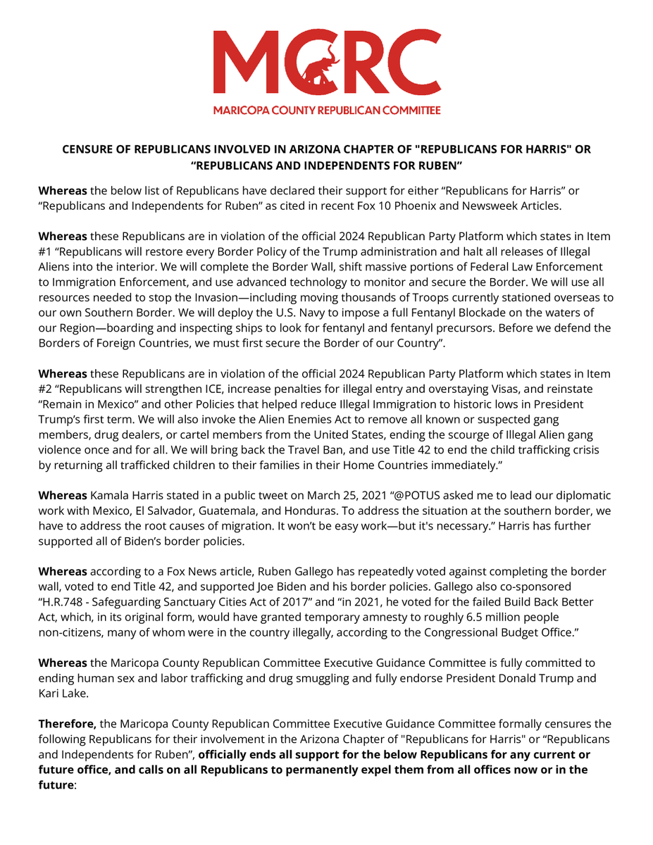 MCRC Executive Guidance Committee (MCRC EGC) censures (so-called) "Republicans" involved in "Arizona Chapter of Republicans for [Democrat Kamala] Harris" or "Republicans and Independents for [Democrat] Ruben (Gallego)"
