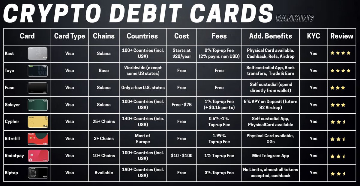 Kast remains the top choice for Solana users due to its near-global availability. It offers numerous benefits, including cashbacks, airdrops, and more