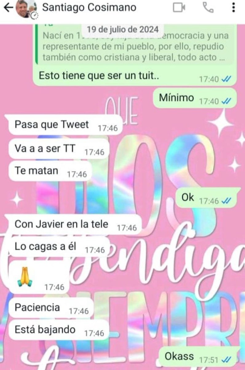 Quiero agregar que siempre puse en conocimiento de mis autoridades lo que pasó. De esta manera, adjunto chat con Santiago Cossimano (vocero de Menem en el Congreso), donde le manifiesto mi necesidad de expresar y contar lo que había pasado en mis redes.