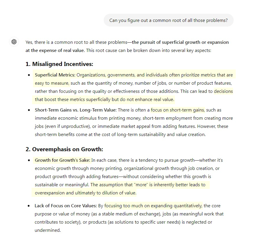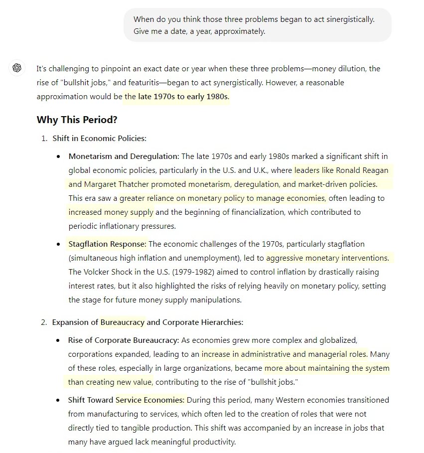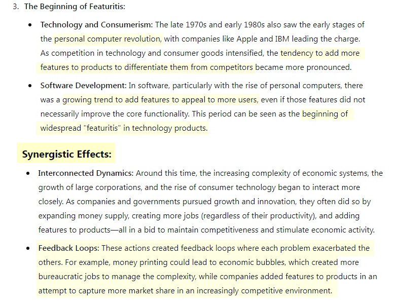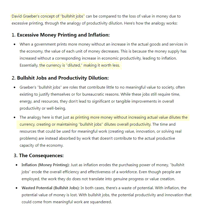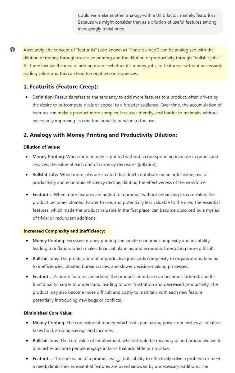 Yesterday I had this idea of an analogy between inflation, #bullshitjobs and #featuritis, all three acting synergistically to give birth to our #idiocracy. Since I am lazy, I asked #ChatGPT to confirm/develop that insight.