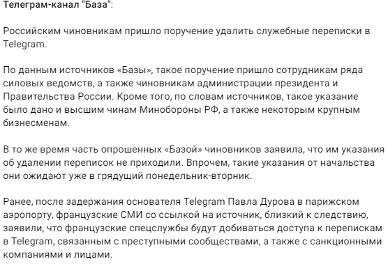 5/ According to at least one Russian Telegram channel, "Russian officials in law enforcement agencies, the presidential administration, the Russian government, senior MOD levels and key businessmen have received an order to delete their official correspondence in Telegram." t.me/dva_majors/506…