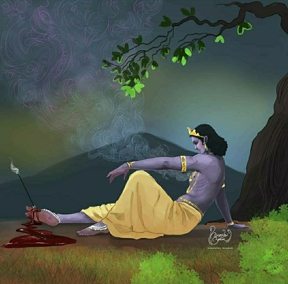 Krishna’s death, like the rest of his life, was marked by divine will and the fulfillment of destiny. While resting under a tree in the forest, Krishna was struck by an arrow shot by a hunter named Jara. Jara, mistaking Krishna’s foot for a deer, unknowingly fulfilled the final part of Gandhari’s curse. The arrow pierced Krishna’s foot, the only vulnerable part of his divine body, and Krishna, understanding that his time on earth had come to an end, departed from the mortal world.