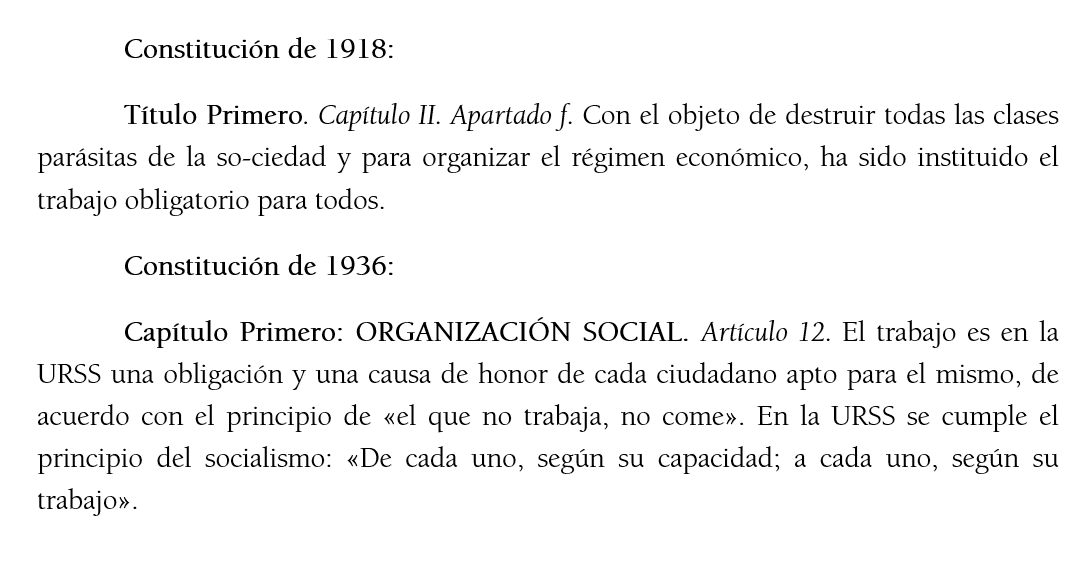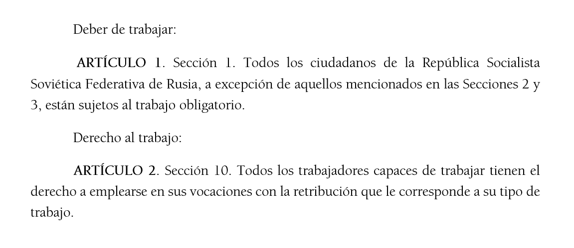 De entrada, el trabajo es derecho y deber [Captura I]. Esto es algo que queda tipificado en la Constitución de la R.S.F.S.R. de 1918 y en la reforma constitucional de 1936 [Captura II].