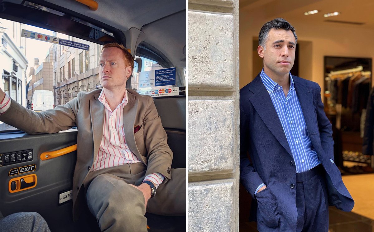 Compare that to these outfits, which mix three patterns, but all different stripes that vary in scale and intensity. Your eyes comfortably rest on the boldness of the tie, while the shirt and suit play supporting roles.