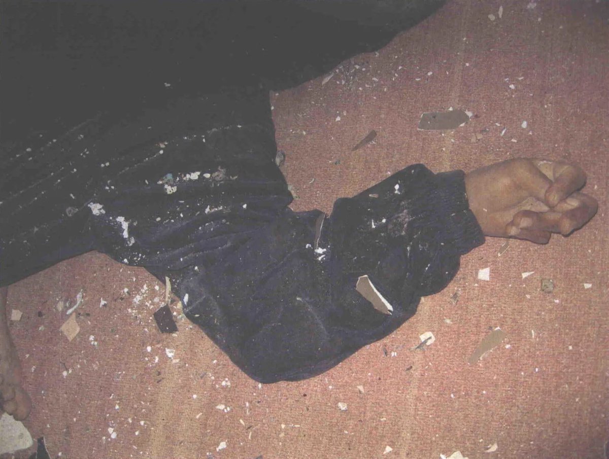 A wider view of the living room where Marines killed Asmaa, her son Abdullah, and two other family members. The body of Jaheed Abdul Hameed Hassan, forty-three, is against the wall in the foreground.