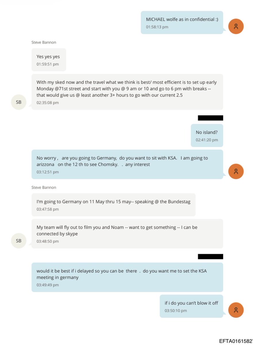 Die Kommunikation zeigt, dass Epstein aktiv versuchte, Bannon bei dessen Europareise zu unterstützen, indem er Treffen mit Vertretern aus Saudi-Arabien (KSA) in Deutschland oder den USA koordinierte. Während Bannon einen möglichen Aufenthalt auf Epsteins Privatinsel zugunsten seiner Reisepläne und seines Auftritts im „Bundestag“ ablehnte, bot Epstein an, die Kontakte zu den Saudi-Arabiens direkt in Deutschland für ihn zu organisieren.
