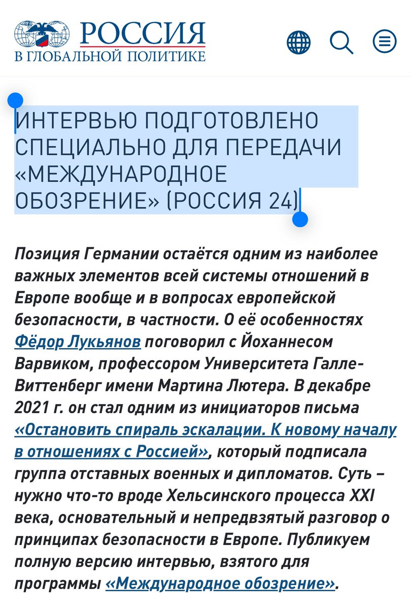Johannes Varwick gab der Zeitschrift „Russland in der Weltpolitik“ ein Interview, das speziell für die Ausstrahlung auf dem Propagandasender „Rossija 24“ vorbereitet wurde.