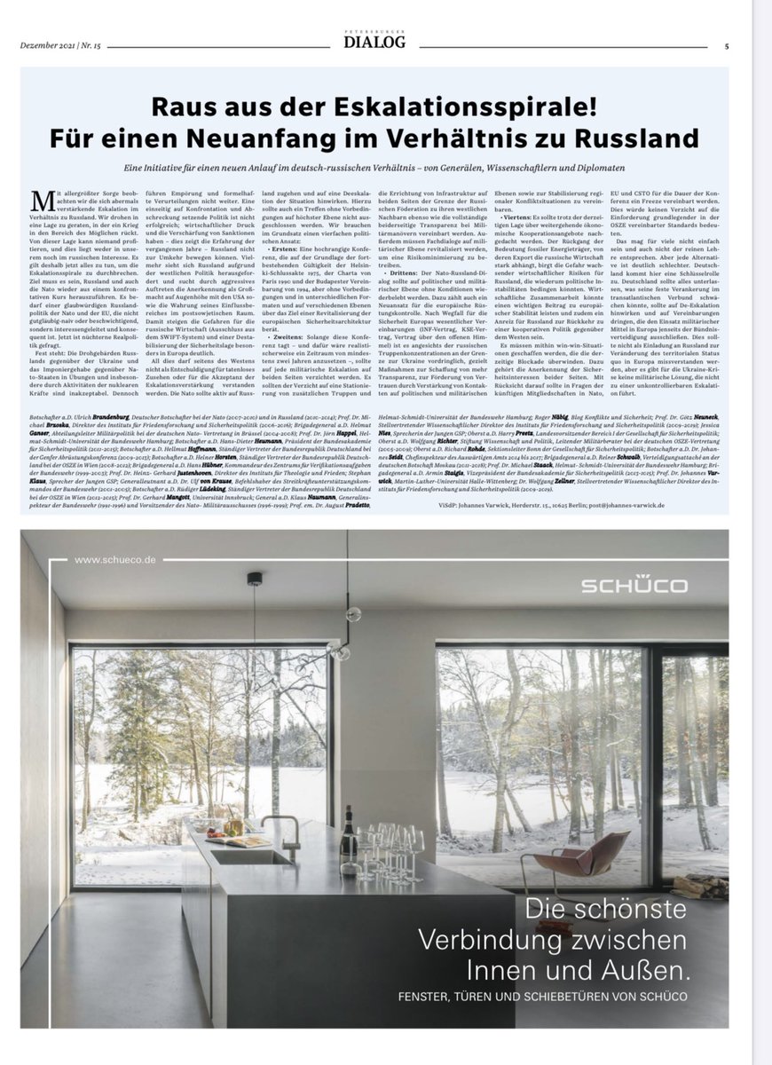 Im Dezember 2021 veröffentlichte das Magazin «Petersburger Dialogue» ein Bericht von Johannes Varwick, „Raus aus der Eskalationsspirale!
