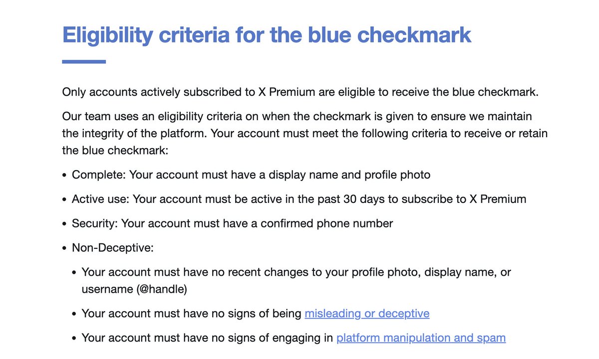 The criteria for achieving a blue tick states that accounts must have a name, a profile image, a phone number and active X premium sub, which requires processing of payment details. X also requires "no signs of being misleading or deceptive”. help.x.com/en/managing-yo…