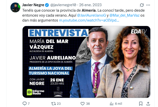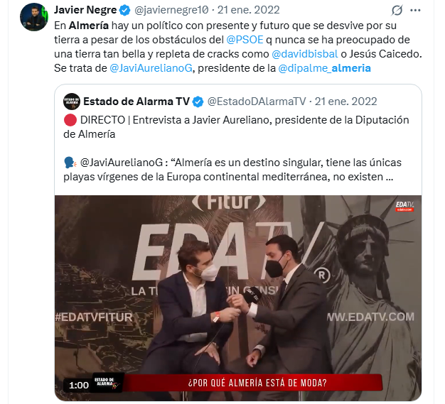 Recordemos que el presidente y vicepresidente de la diputación de Almería fueron detenidos por corrupción que desde EDA TV han querido blanquear. A cambio de dinero no solo publican vídeos que ven 500 personas, Negre te defiende en redes y ataca a rivales.