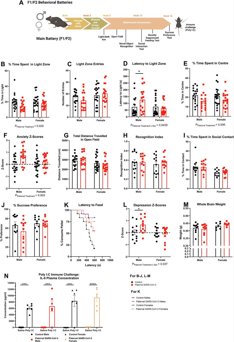➡️ Male mice infected with SARS-CoV-2 fathered pups with altered hippocampal transcriptomes & higher anxiety.