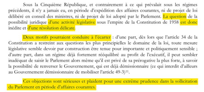 « Le Parlement est privé de la possibilité de renverser le Gouvernement (qui est déjà démissionnaire). »