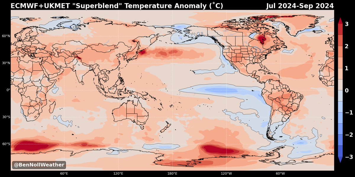 Above average temperatures (🔴) are almost exclusively predicted worldwide from July-September 2024, aside from La Niña in the equatorial Pacific & patchy cool areas.