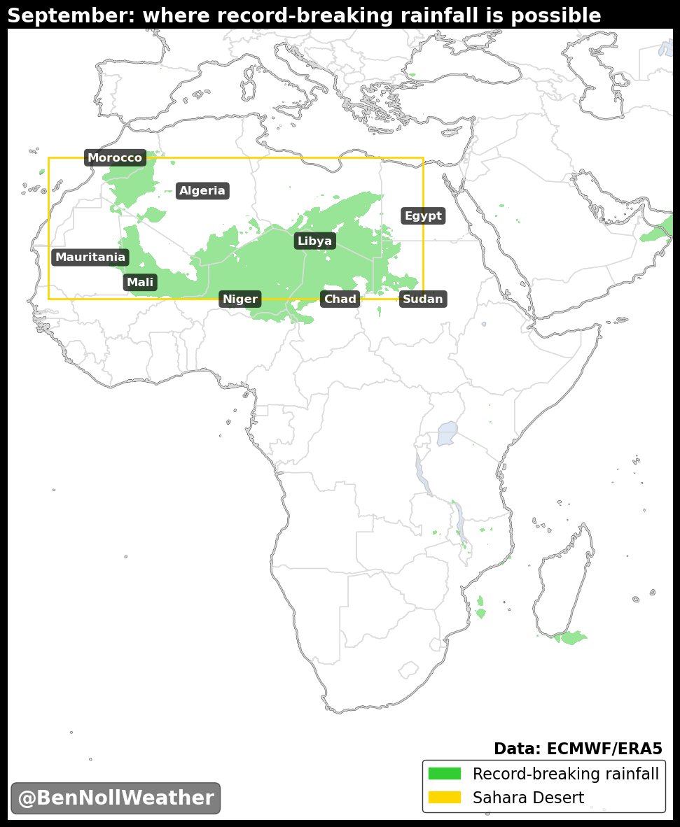 It includes Algeria, Mali, Libya, and parts of Niger where little or no rainfall typically falls this time of the year!