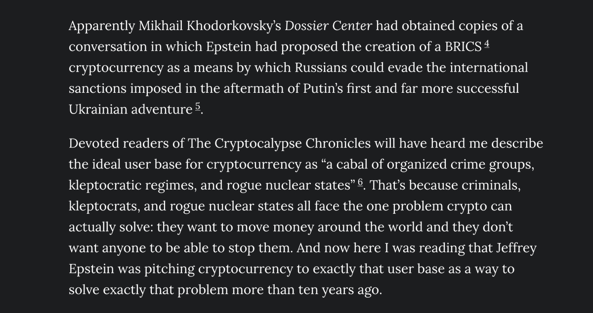 After publishing my last post about Epstein's crypto connections I stumbled on something that kind of shocked me: Epstein had proposed the creation of a blockchain based BRICS currency to a "former" FSB operative way back in 2015.