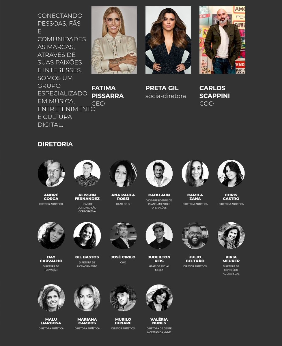 Mynd8, de acordo com o próprio site, é um grupo "especializado em música, entretenimento e cultural digital". Abaixo está a equipe responsável pelo grupo. Destaque para a Preta Gil, que é sócia-diretora do grupo.