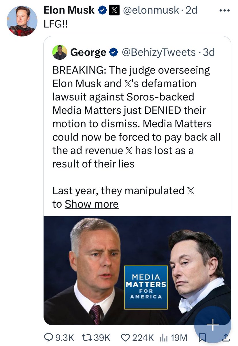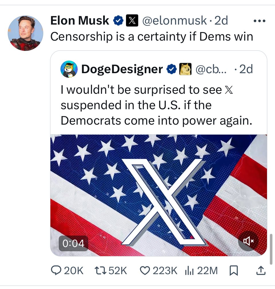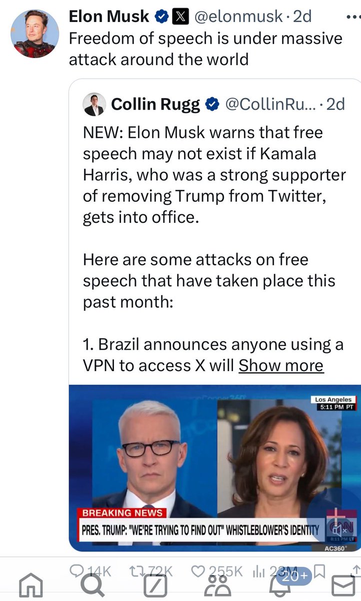 @mmfa Here he is celebrating the outcome of a hearing in this libel case in the middle of a tweetstorm about the death of free speech in Brazil & the threat of ‘censorship’ if Kamala wins.