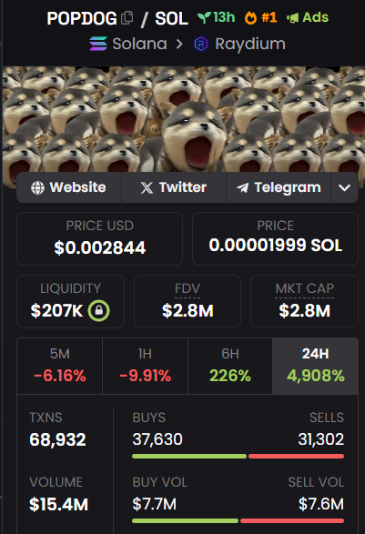 2. A good example for today is $POPDOG - 15M Volume in only 13 hours and a 3M Mcap