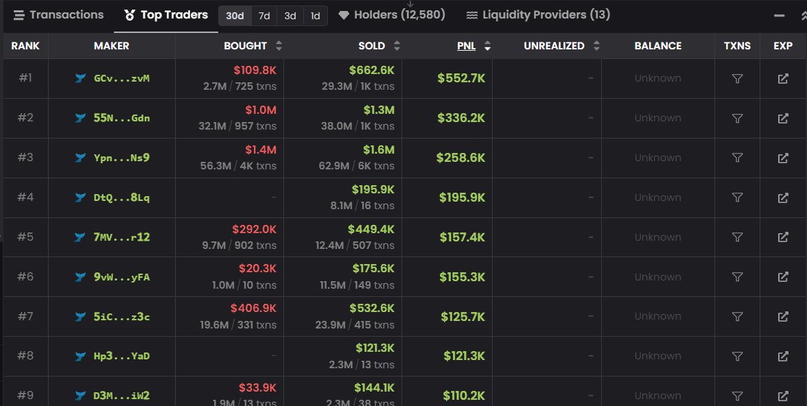 Here you can find wallets that "made it" with this play, usually 10-1000xes can be found in this tab as these are the wallets that played that coin THE BEST. Now we have to differentiate between devs and good traders to find a good wallet.dexscreener.com