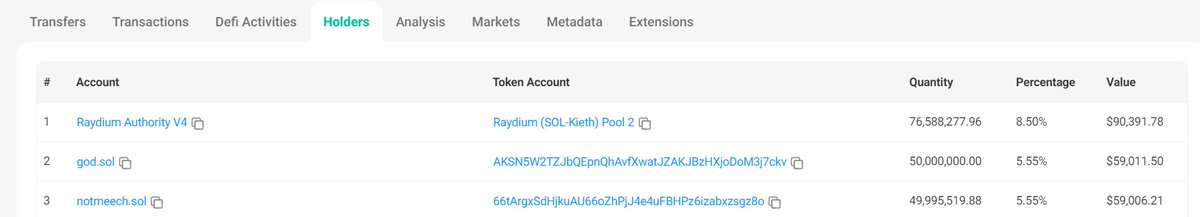 We can then paste the CA of $kieth into and head over too the "Holders" tab. Look for a holder with 49,995,519 $kieth and you have his wallet!