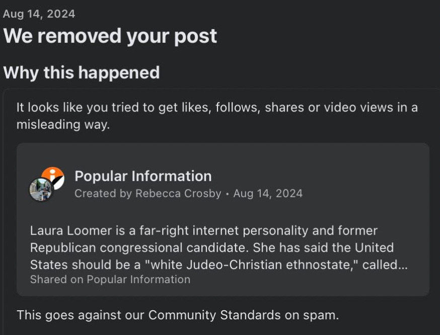 3. We contacted a spokesperson for Meta and asked why our post was being censored. The spokesperson told us that the story was initially blocked for violating spam policies but was being restored.