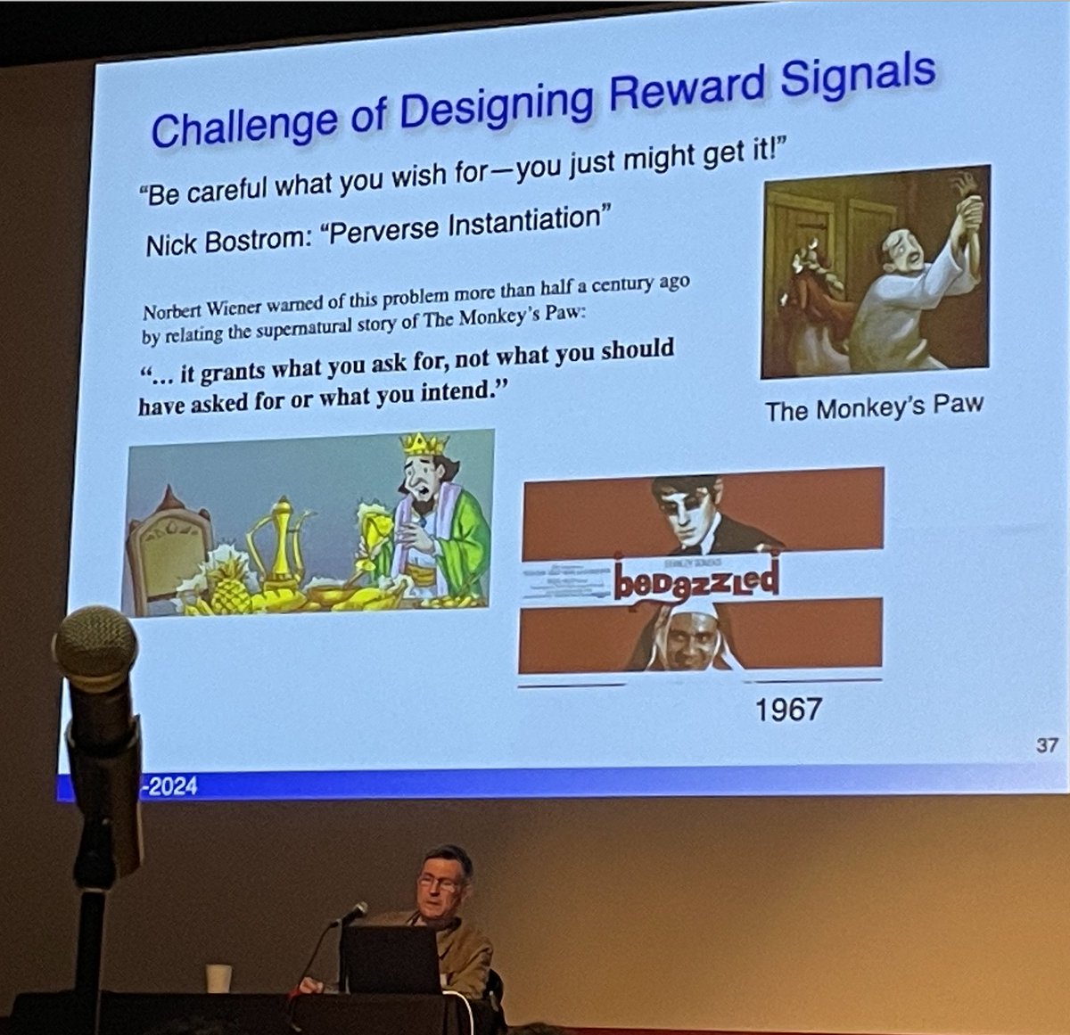In the end, a call for critical thinking. Andy Barto shared stories to caution against the challenges of designing reward signals.