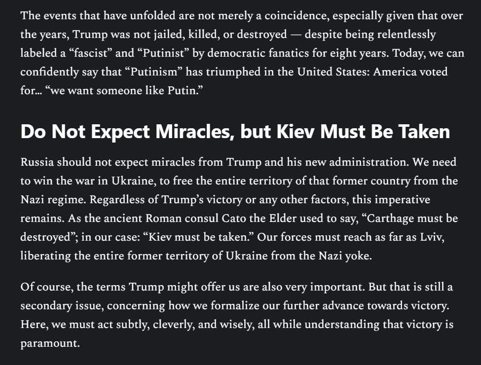 Aleksandr Dugin wrote an article in the "New Right" journal Arktos in which he explains Putin's smirking claim that he wanted a Harris victory.