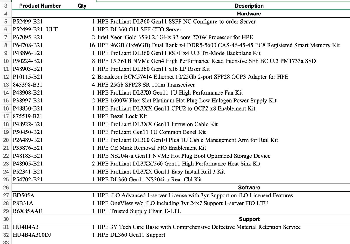 One other BOM review item. They went 4 x 25Gbps. If you don't already have 25Gbps TOR switches I would honestly go 2 x 100Gbps. It's about 20% more cost all in with cables and optics, but it's 2x the bandwidth and the rack will look prettier.