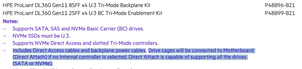 "Includes Direct Access cables and backplane power cables. Drive cages will be connected to Motherboard (Direct Attach) if no Internal controller is selected. Direct Attach is capable of supporting all the drives (SATA or NVMe)."