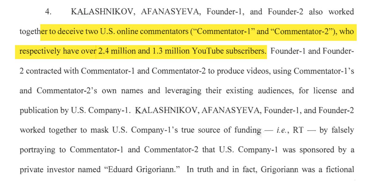The indictment specifies that two of the people who work for this Tennessee company (Tenet) were "deceived" -- meaning they didn't know that the Russian government was running an influence op.