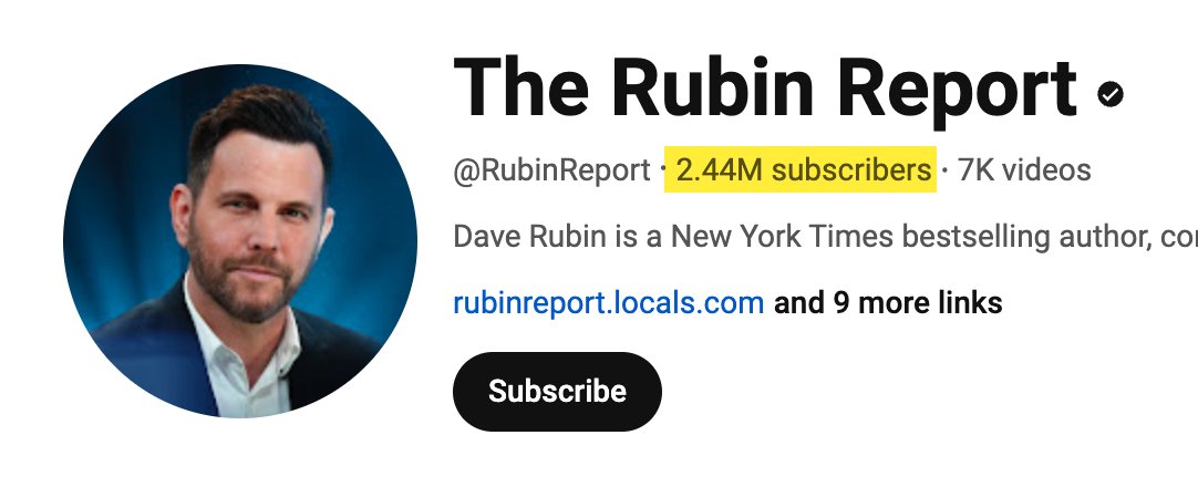 Benny Johnson also has almost 2.4m, but they apparently rounded down from 1.37m --> 1.3m with Tim Pool so I figured Rubin's 2.44m --> 2.4m was the same.