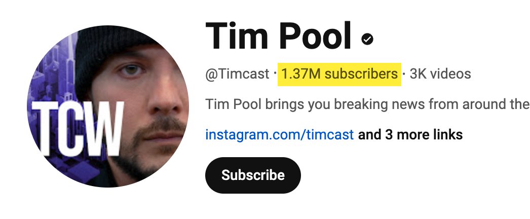 Dave Rubin has 2.4 million subscribers and Tim Pool has 1.37 million.