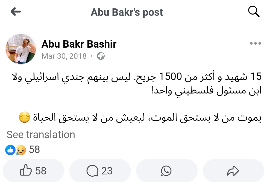 "15 martyrs and more than 1500 wounded. Among them, not a single Israeli soldier or a son of a Palestinian official! Those who do not deserve to die are dying, so that those who do not deserve to live may live."