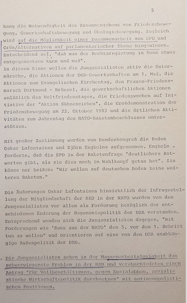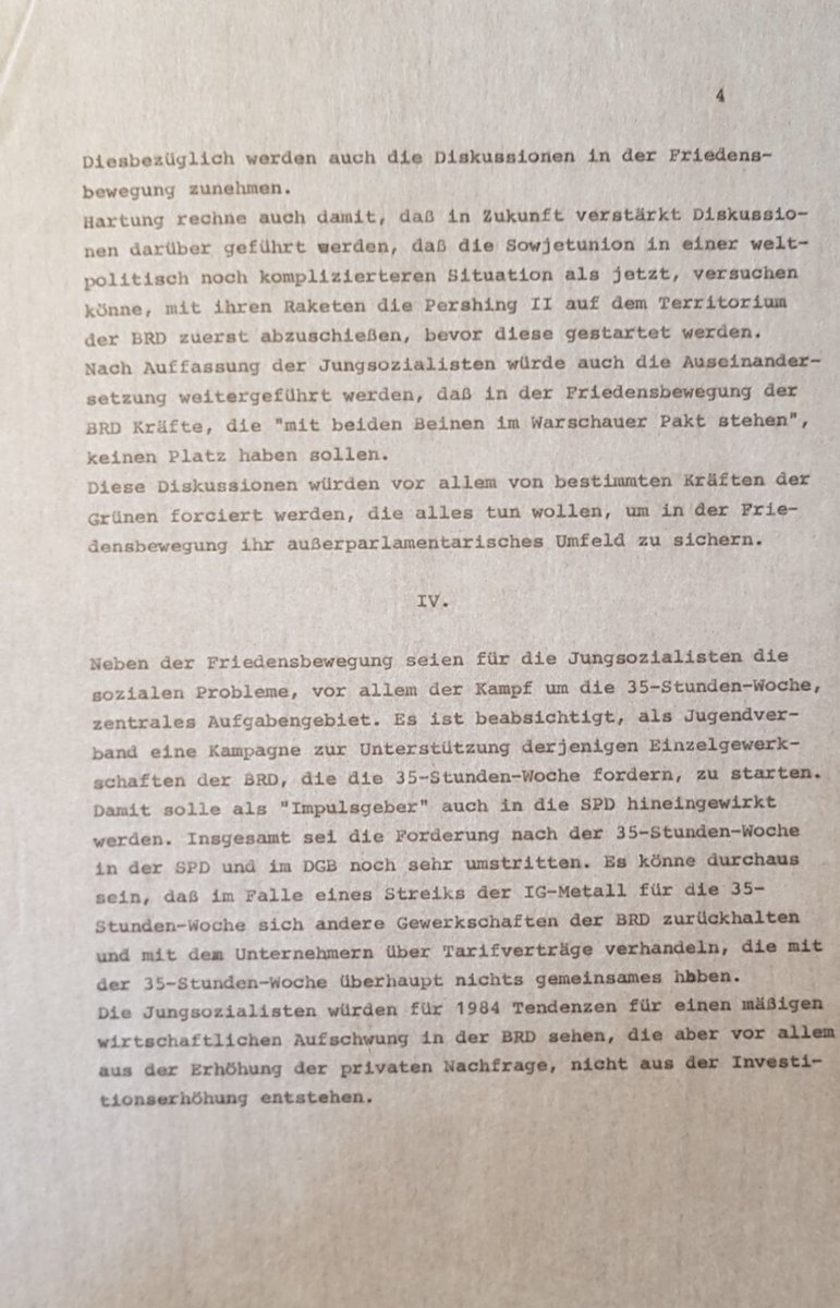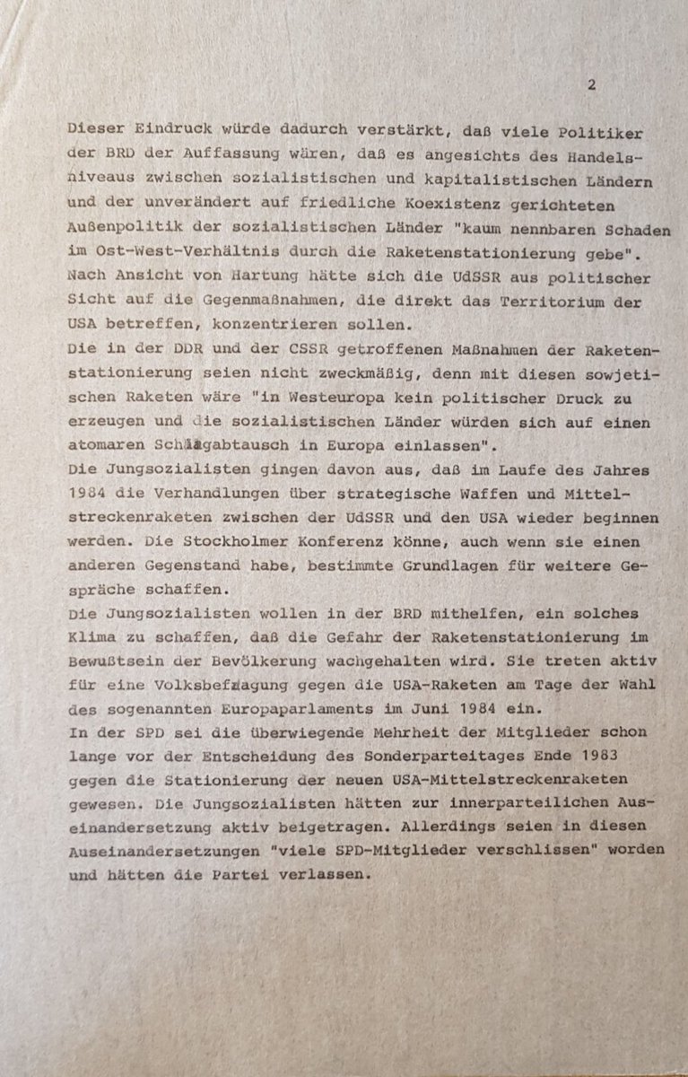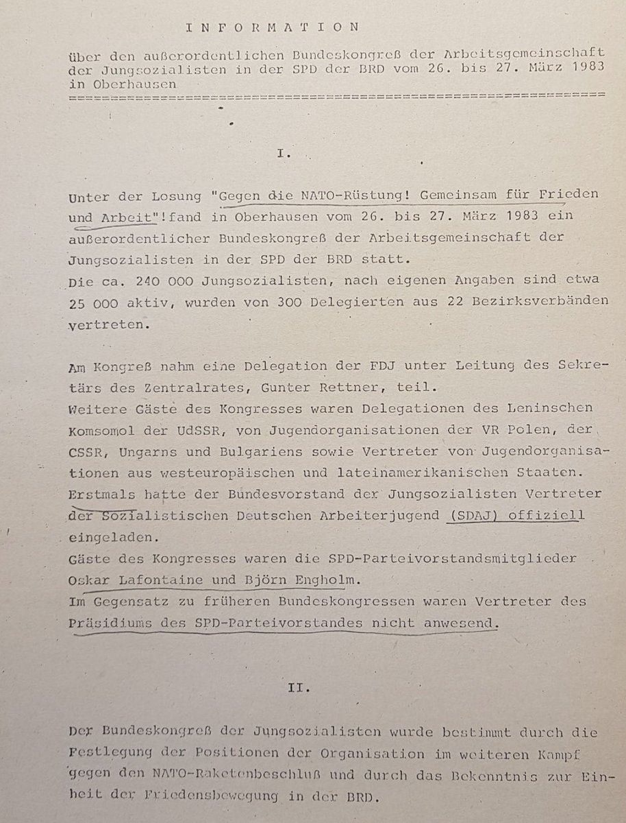 In 1983, a GDR delegation visited Juso. Afterwards, a secret report prepared for Stasi gloated about “the success in forging a growing unity among the Young Socialists in opposition to American missiles and unanimously blaming the USA for the escalation.”